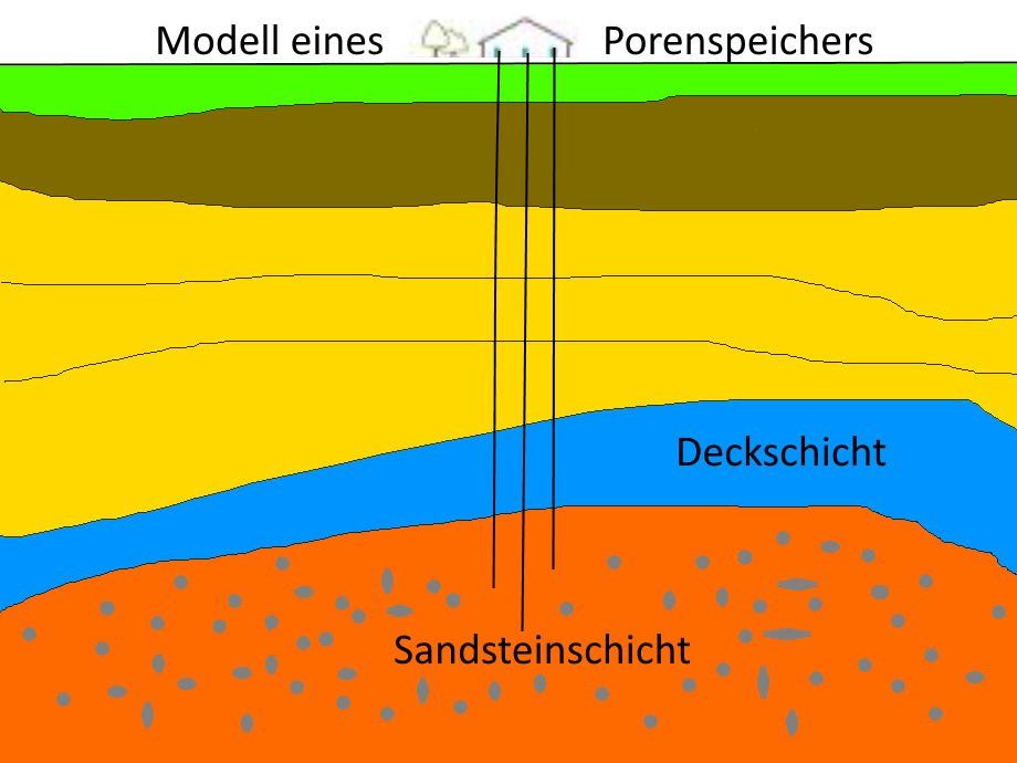 Das Gas wird über Erdgasleitungen bis nach Itterbeck geleitet und dort in die Tiefe gepresst. Der Untergrund ist hier nämlich besonders günstig. In der Tiefe liegt eine mächtige Schicht aus Sandstein. Sie ist porös, das heißt, zwischen den Steinen sind Hohlräume entstanden, in denen sich vor vielen Millionen Jahren Erdgas bildete.