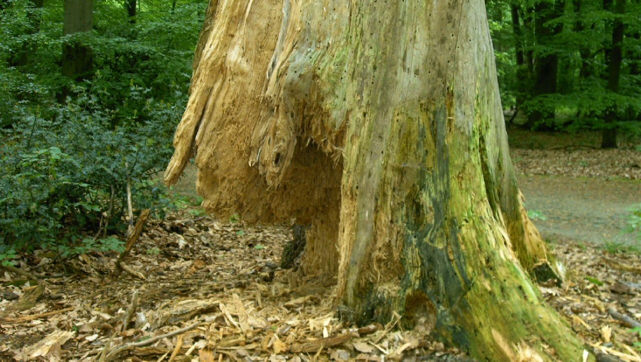 Ein sterbender Baum wird von Pilzen befallen, die das Holz langsam abbauen. Aber noch in dem toten Holz leben viele Käferarten. Es entstehen Höhlen und Spalten, die von den Tieren genutzt werden. Wildbienen oder Hornissen bauen ihre Waben darin, Vögel nutzen sie für ihre Nester. Es dauert viele Jahre, bis sich das Holz vollständig zersetzt hat. Übrig bleibt Humus, der auch die Rückstände des Laubes und morscher Äste und Zweige enthält.